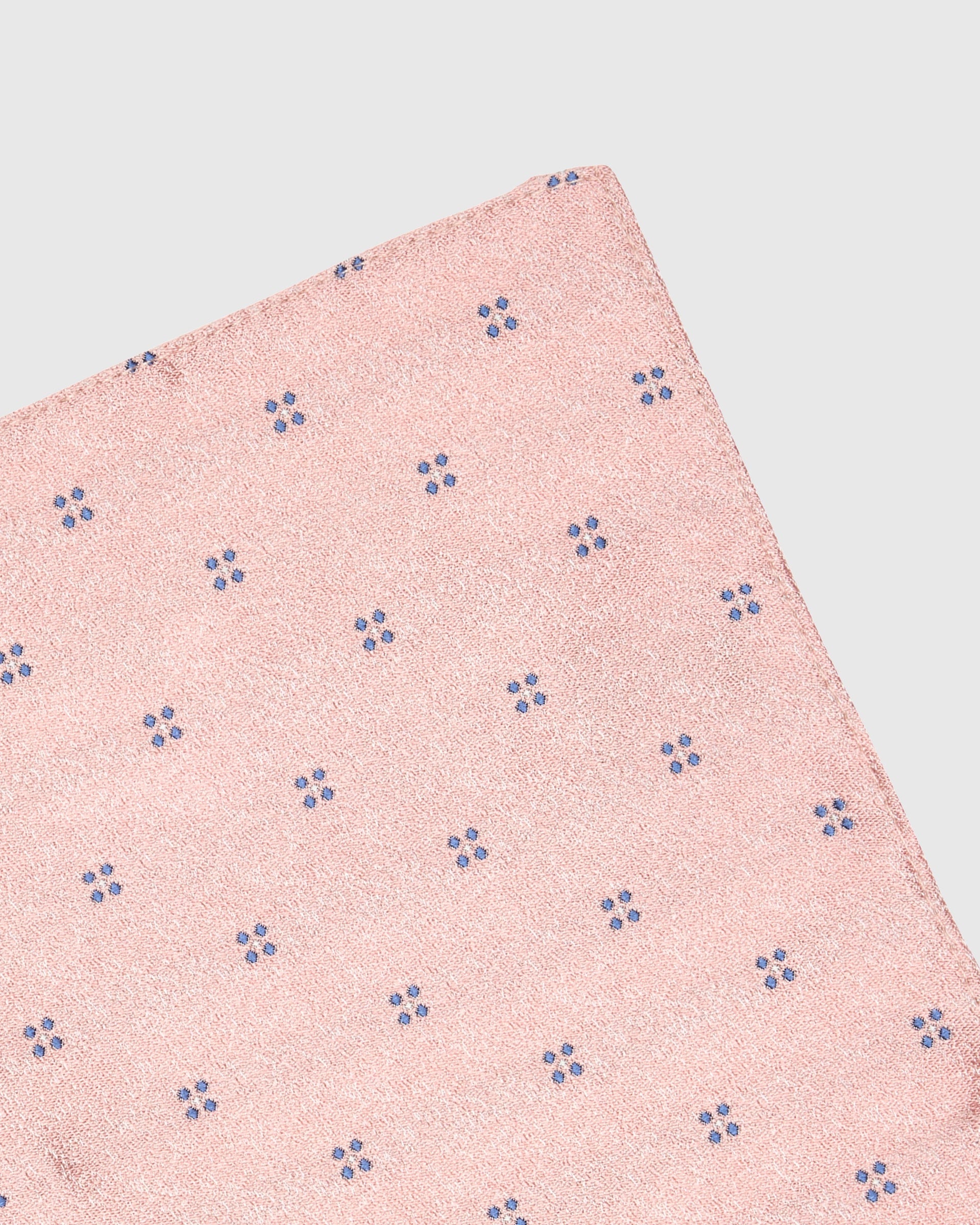 Constructed in Italy from a fine silk, this pink pocket square features a subtle blue geometric design. Complete the look by pairing it with the matching neck tie.